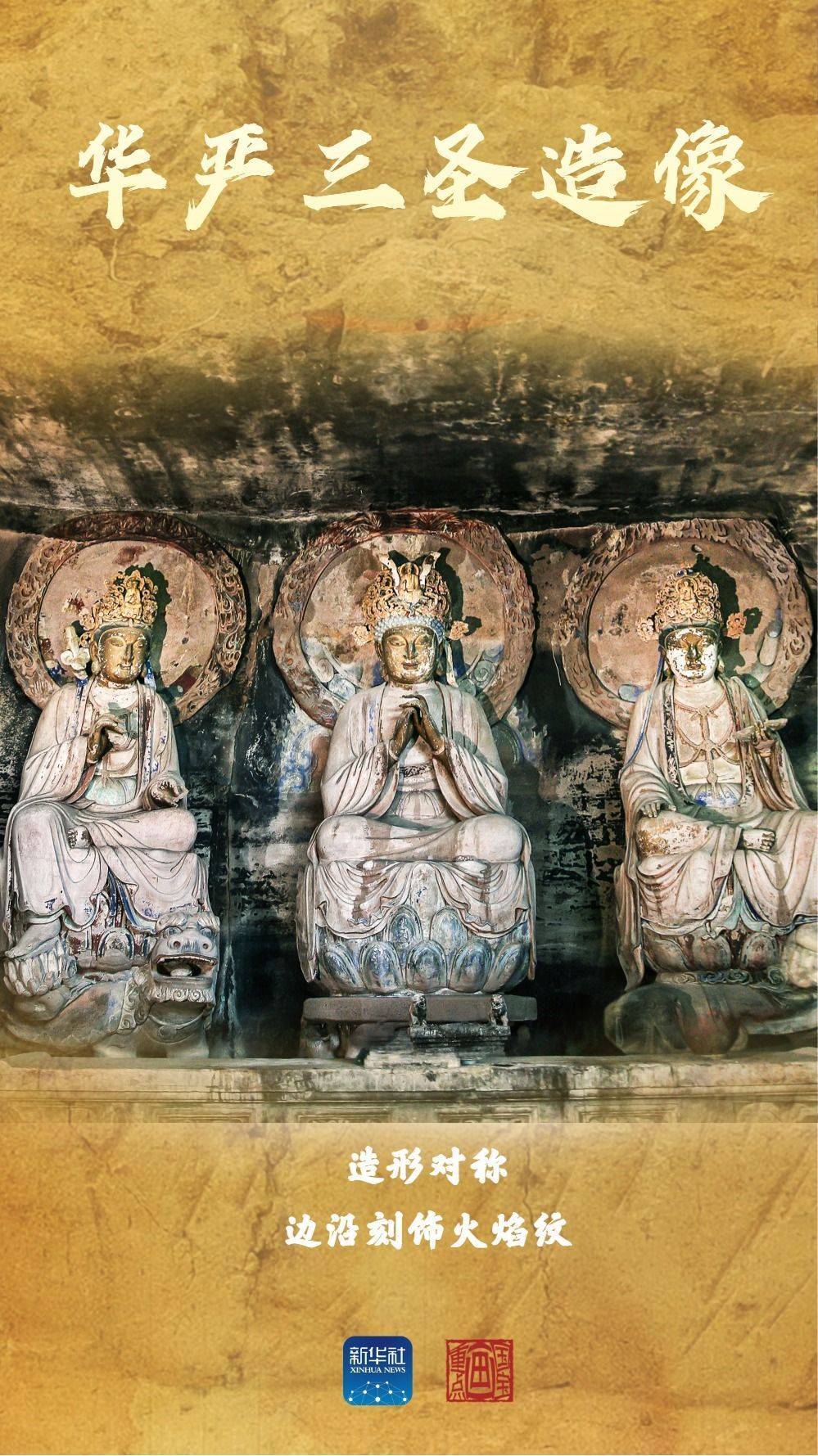 “华严三圣”三尊佛像高为5.2米,中为毗卢遮那佛,左右分别为普贤菩萨与文殊菩萨,结跏趺坐于白象、青狮背上。左右侧壁各刻有通高4.1米的菩萨各五身,壁上方刻有善财童子五十三参图,壁前端各刻有一只下山吼。全窟构思巧妙、布局严谨、动静结合,堪称石刻艺术精品。