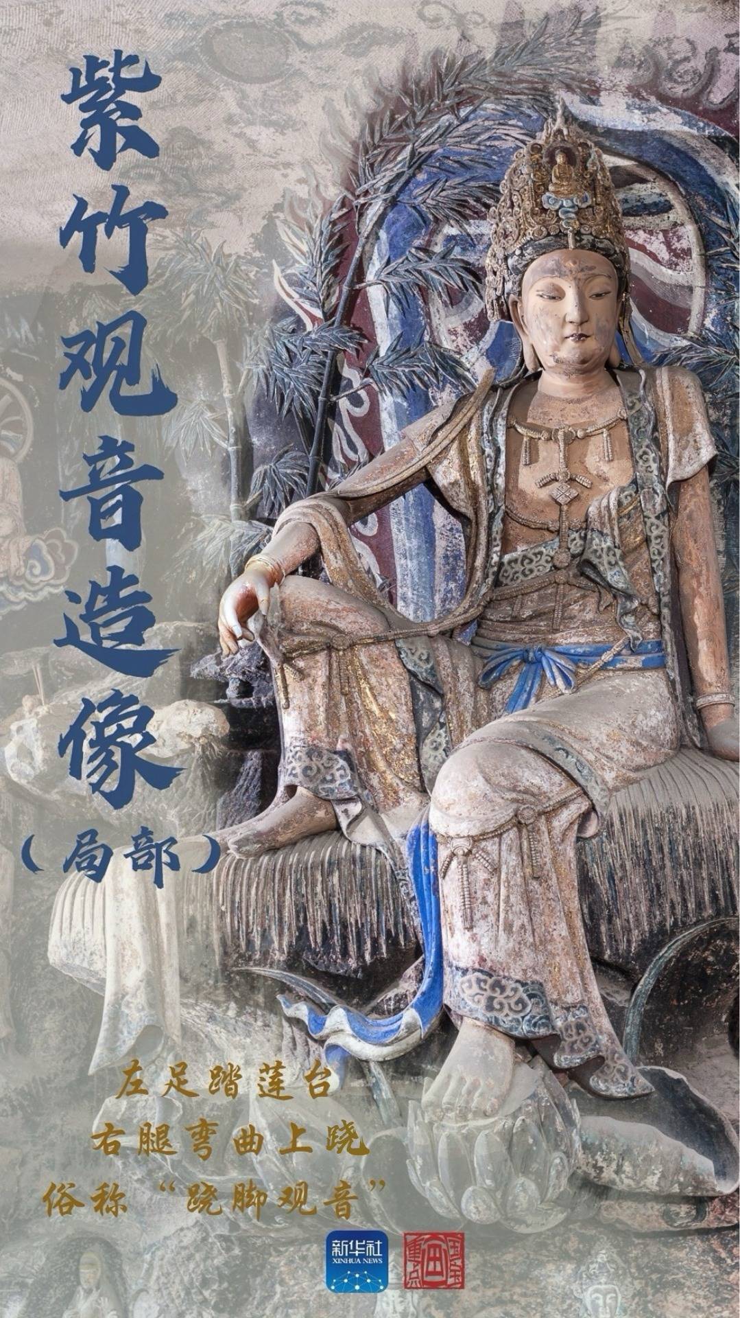 紫竹观音造像位于第五批全国重点文物保护单位毗卢洞内。该洞石刻造像主要开凿于宋代,后经历代修缮补刻。这尊观音像高3米,悬坐于3米长的弧形荷叶上,头戴镂空花冠,彩带飘逸,上身微左侧,左手抚撑叶面,右手呈“兰花手”放于膝上,赤脚。与常见的直立、端坐的观音造像不同,这尊雕像姿态悠然、神情自若,其潇洒之态仿佛在与千年后的游客对话。